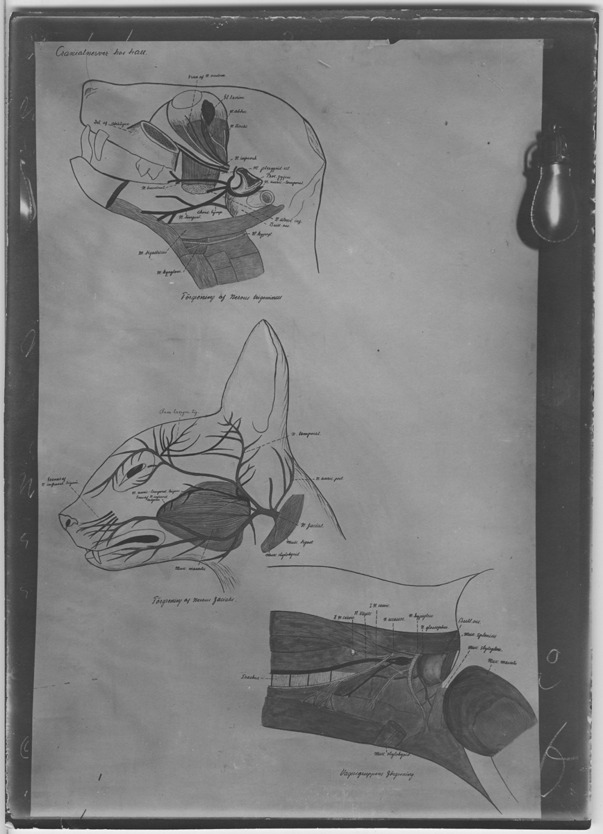'Teckning av kranialnerver hos katt. Illustration av fögrening av nervus trigeminus, nervus facialis samt av vagusgruppen. :: :: På fotografiet finns ett föremål som liknar ett örhänge. :: :: ''Fotografier använda vid dissektionskursen våren 1928'' . :: Avfotograferade teckningar på skelett och organ. :: På baksidan av vissa står det Kerstin Nyblén :: V.T.-18 :: , ur bok'