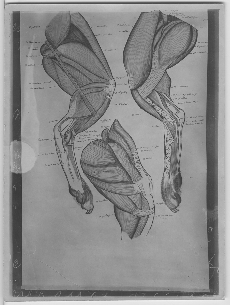 'Teckning av muskulatur hos katt? Latinska namnen på delarna utsatta. :: :: ''Fotografier använda vid dissektionskursen våren 1928'' . :: Avfotograferade teckningar på skelett och organ. :: På baksidan av vissa står det Kerstin Nyblén :: V.T.-18 :: ur bok'