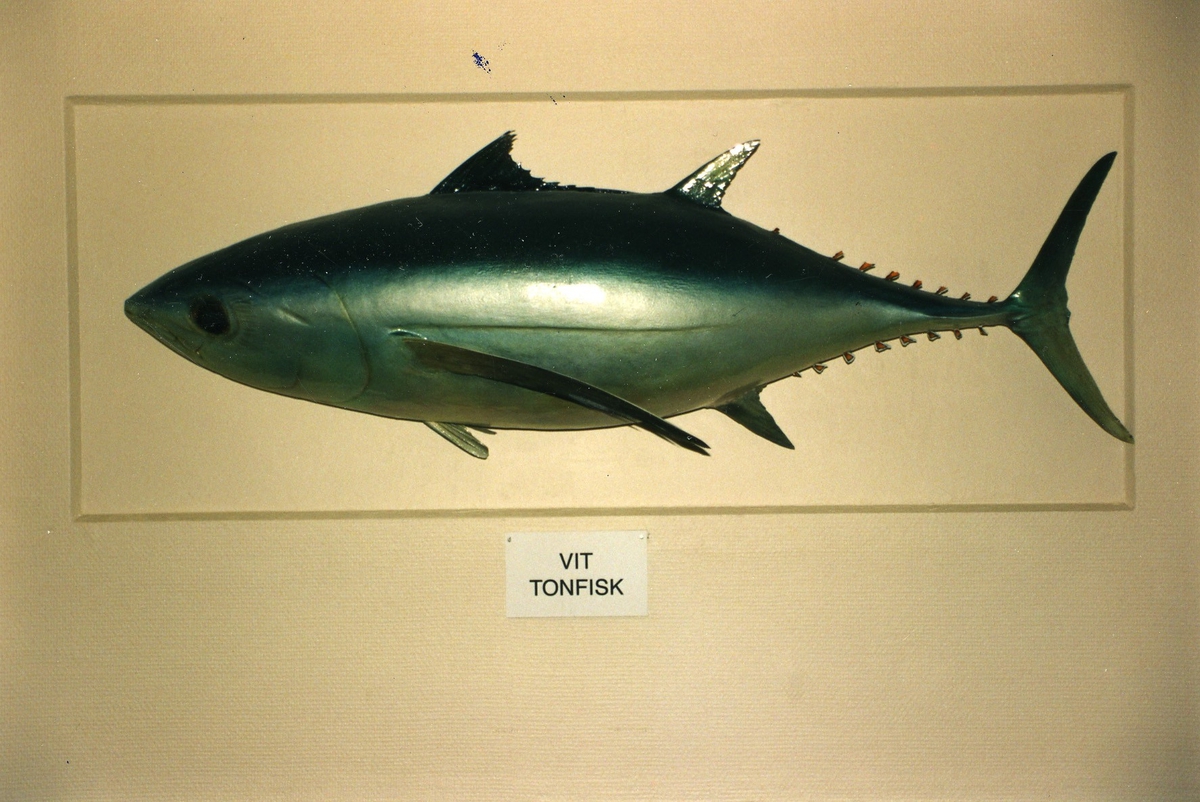 'Vit tonfisk: H 50, Br 50, D 30 cm. Fyndår 1906. Sedd från sidan. :: Avgjutning från Malmö museum. I basutställningen, Göteborgs Naturhistoriska museum 2003. Avgjutningen gjord av Olof Gylling. :: :: Ingår i serie med fotonr. 6063:1-7 med bilder på avgjutningar gjorda av Olof Gylling och E. Einfeldt (gråhaj). Göteborgs Naturhistoriska museum har fått dessa avgjutningar som gåva från Malmö museum 1994-09-27.'