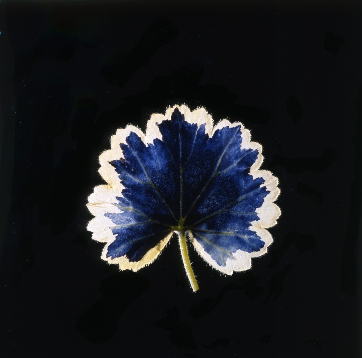 'Pelargonblad, blåa partiet visar var fotosyntesen håller på. I det vita yttre partiet sker ingen fotosyntes. :: :: Ingår i en serie med fotonr 6127 med färgdia som användes i utställningen ''Gröna fabriken''.'