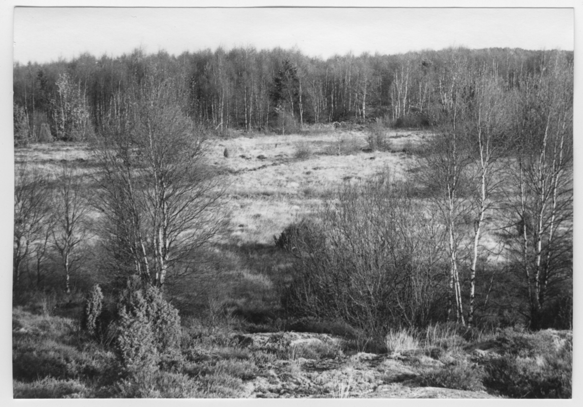'Bildtext: ''Kärr. Riktning 16.'' :: Vy med öppnare parti, kärret, och i förgrunden berghäll med enbuskar och björk. På avstånd ev. stenmur, stengärdesgård. :: :: Ingår i serie med fotonr. 6970:1-1125, dokumentation av Hisingens naturgeografi, visande landskapsformerna i stora drag och gjord inför exploateringen av området. Platserna för fotograferingen finns utsatta på karta i skala 1:4000 som finns på Göteborgs Naturhistoriska musem. Fotoriktningen mättes med kompass i gammalgrader.'