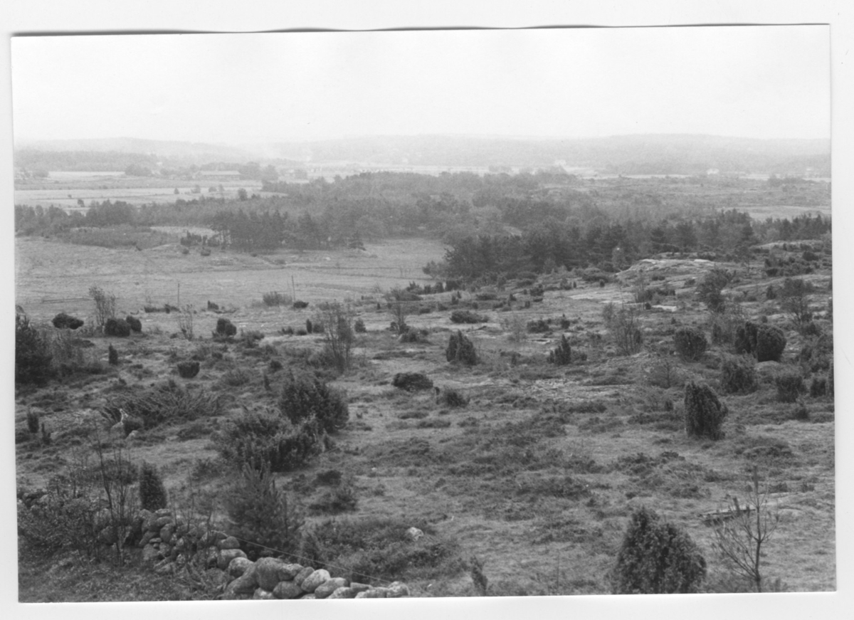 'Bildtext: ''Hällandskap. Riktning 160.'' I förgrunden berghäll med stenmur bevuxen med ljung, enbuskar, tall och buskar. I fonden öppna fält och gårdsbyggnad. Stengärdesgård. :: :: Ingår i serie med fotonr. 6970:1-1125, dokumentation av Hisingens naturgeografi, visande landskapsformerna i stora drag och gjord inför exploateringen av området. Platserna för fotograferingen finns utsatta på karta i skala 1:4000 som finns på Göteborgs Naturhistoriska musem. Fotoriktningen mättes med kompass i gammalgrader.'