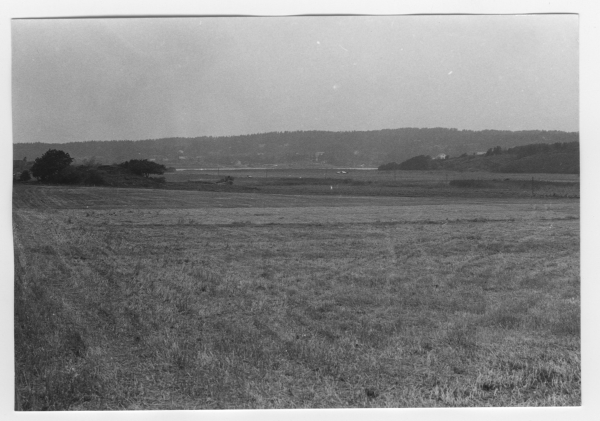 'Bildtext: ''Sedimentyta. Riktning 320.'' Vy ut över öppet fält, åker, på avstånd berghäll med enstaka träd. I fonden hus i trädbevuxen bergsluttning. :: :: Ingår i serie med fotonr. 6970:1-1125, dokumentation av Hisingens naturgeografi, visande landskapsformerna i stora drag och gjord inför exploateringen av området. Platserna för fotograferingen finns utsatta på karta i skala 1:4000 som finns på Göteborgs Naturhistoriska musem. Fotoriktningen mättes med kompass i gammalgrader.'