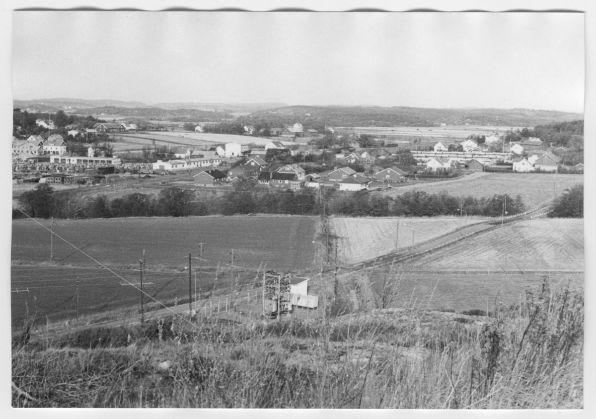 'Bildtext: ''Sedimentyta.'' Riktning 308.'' Bilden tagen från höjd, i förgrunden elstation och asfalterad väg med åkrar, fält på båda sidor. På avstånd större samling hus. Fält och trädklädda berg i fonden. :: :: Ingår i serie med fotonr. 6970:1-1125, dokumentation av Hisingens naturgeografi, visande landskapsformerna i stora drag och gjord inför exploateringen av området. Platserna för fotograferingen finns utsatta på karta i skala 1:4000 som finns på Göteborgs Naturhistoriska musem. Fotoriktningen mättes med kompass i gammalgrader.'