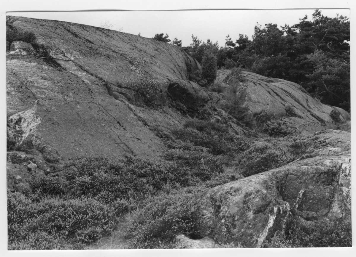 'Bildtext: ''Häll. Riktning 22.'' Berghäll med ljungvegetation, enbuske, tall och i bakgrunden sticker tall fram. :: :: Ingår i serie med fotonr. 6970:1-1125, dokumentation av Hisingens naturgeografi, visande landskapsformerna i stora drag och gjord inför exploateringen av området. Platserna för fotograferingen finns utsatta på karta i skala 1:4000 som finns på Göteborgs Naturhistoriska musem. Fotoriktningen mättes med kompass i gammalgrader.'