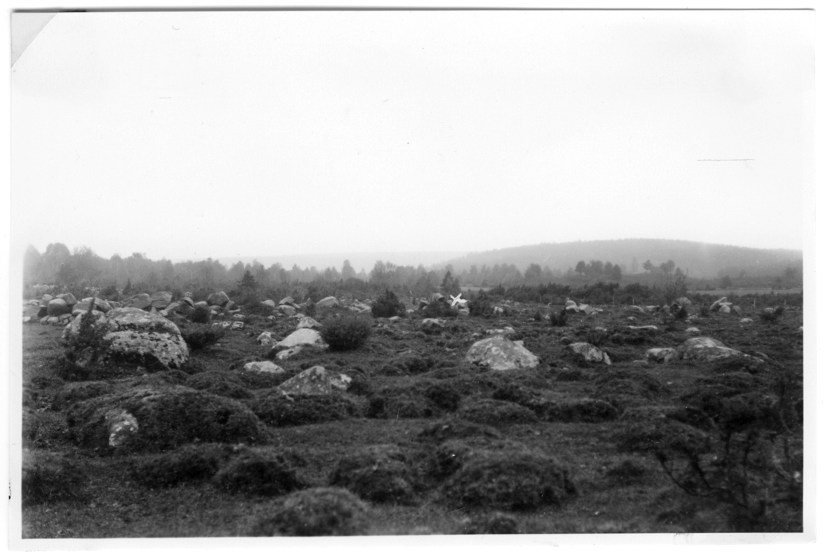 'Vy med blockrik mark med viss buskvegetation. :: Text till fotot: ''Fyndplats för renhorn markerat med X. Bilden vid Östra Gerum från sydost. I förgrunden den plana blockmarken, till höger i bakgrunden Gerumsberget.'' :: :: Ingår i serie med fotonr. 6997:1-3, med foton som finns i Arkivhandling med nummer 879 på Göteborgs Naturhistoriska museum. :: :: Se även fotonr. 4265 och 4476.'