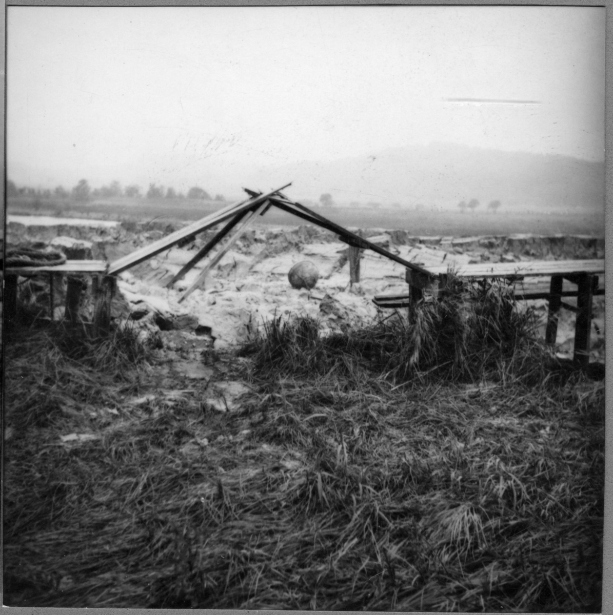 'Bildtext: ''En brygga som blivit hoptryckt.'' Vy med uppbruten brygga i förgrunden. I fonden berg. Skred. :: :: Ingår i serie med fotonr. 7052:1-19 med bilder bl.a. från Surteskredet.'