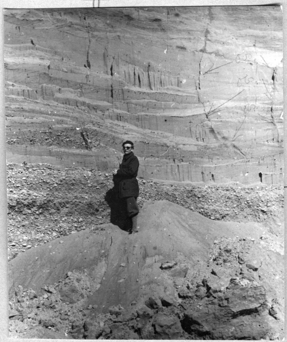 'Bildtext: iskilar (?) i D1-sand. Obs! ligger stratigrafiskt högre upp än vindslipade stenarna, som iakttagits på lägsta höjd 9,5 meter över havet. :: D1 och D2 korridoren. Nedre grustaget, norra väggen. Mjälaränden. :: Gränsen mellan D1 och D2 (9,5 m.ö.h.) är i jämnhöjd med mannens midja där man också ser en tydlig skillnad i struktur mellan lagren. :: :: Bilderna med fotonr. 7061:7-8 hör samman och har samma bildtext. :: :: Ingår i serie med fotonr. 7061:1-14. Serien består av material från Åke Hillefors (inkommet 2004).'