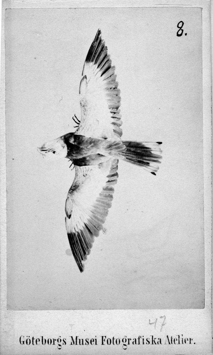 'Månterad blåråka, sedd från ryggsidan med vingarna utbredda. :: :: Text till bilden: ''Blåråkan är en af vårt lands vackraste foglar. Hon träffas i löfskogar i det södra och mellersta Sverige och finnes, ehuru sparsamt, äfven i Göteborgs grannskap, t.ex. vid Lerje. Hon är ock en av våra skyggaste, så att blotta åsynen af menniskan, jagar henne högt öfver skogen, hvarvid man får höra ett simpelt rack rack. Om hösten far hon till södern, men då sipporna nyfiket titta på majsols gång, hela dagen lång, då ha vi henne åter. Hon bygger sen sitt bo i ett ihåligt träd och lägger deri 4-6 hvita, glänsande ägg. Blåråkan lefver mest af insekter, maskar och sniglar, men blir sjelv ej sällan uppäten, då hennes kött är ganska välsmakande. Ty icke sker det för hennes fagra yttre, som är en prydnad för skogen, ej heller derföre att hon bidrar till att rensa den från skadedjur.'' /August Wilhelm Malm år 1866. :: :: :: Serie med fotonr. 7079:1-37. Fotografierna är monterade i en liten bok, inbunden, med titel ''Fotografier öfer Däggdjur och foglar. Texter av A. W (1866). Malm. Boken återfinns i Göteborgs Naturhistoriska Museums bibliotekssamling under ''Äldretryck''. På baksidan av varje foto finns en text om arten. :: :: Se även fotonr. 5693:1-4.'