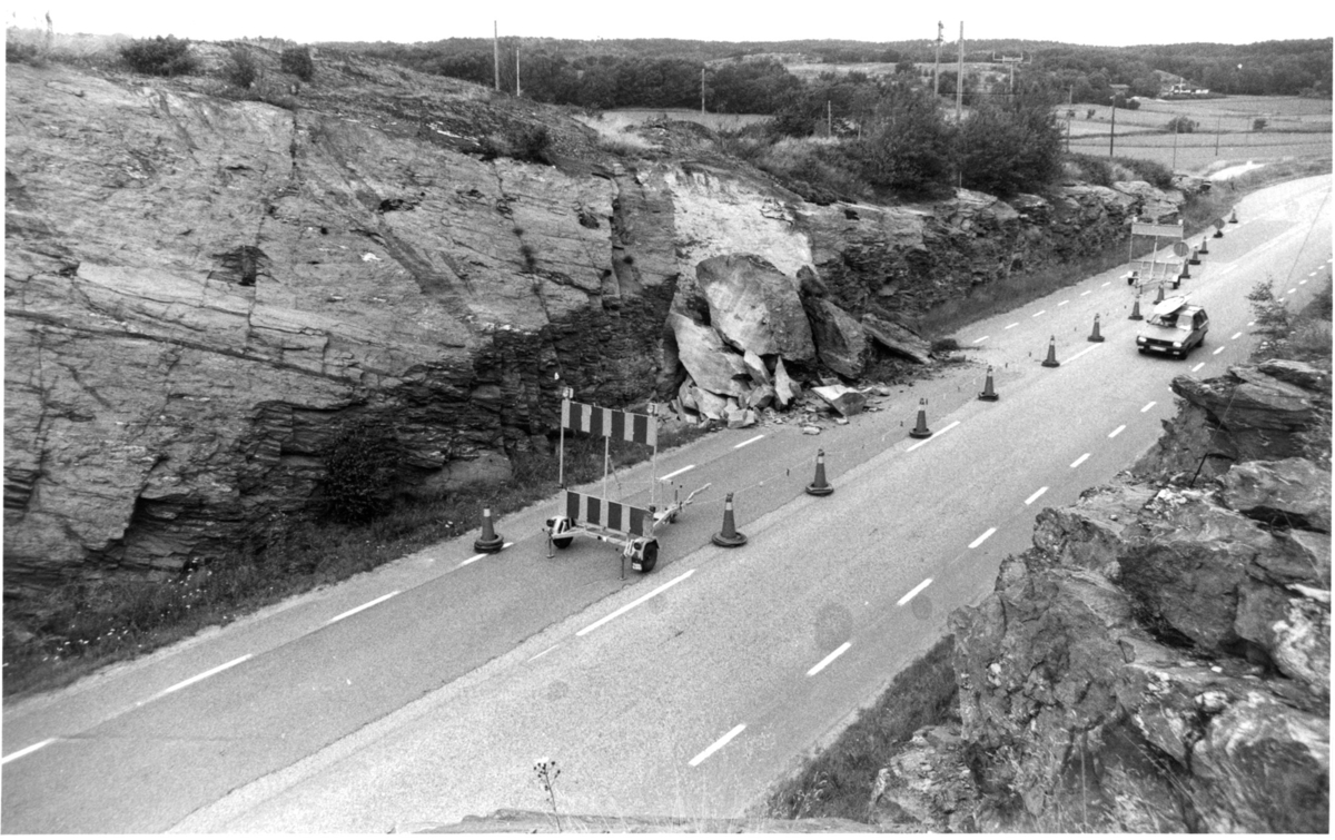 'Fagerfjäll, bergras: :: Vy över området med bergväggen som rasat, närmsta vägbanan intill bergväggen är avspärrad, 1 bil körande på andra halvan. :: :: Ingår i serie med fotonr. 7019:1-12 med bilder från bergras i Fagerfjäll.'