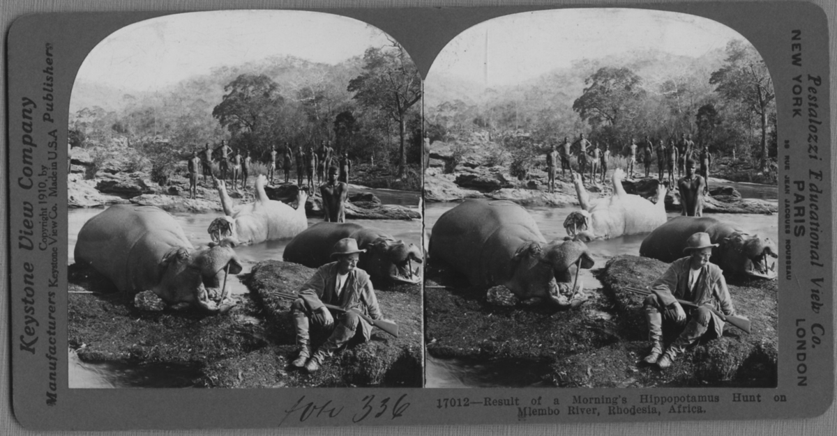 'Flodhästjakt vid Mlembo floden. 1 st man med gevär i förgrunden, 3 st döda flodhästar och i bakgrunden ca 13 personer. :: :: ''17012 - Result of av morning´s hippotamus hunt on Mlembo river, Rhodesia, Africa.'' :: :: Ingår i serie med fotonr. 315-422.'