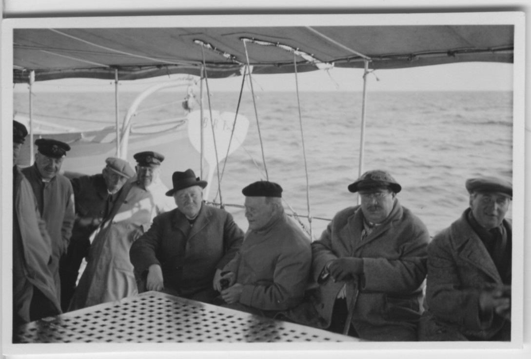 'Biologiska föreningens utfärd till Läsö och Nordre Rönner: :: :: ''På väg till Läsö.'' 8 st män sittande och stående längs relingen ombord på båten ''BRIS''. Tredje från höger sitter arkitekt C.O. Svensson. :: :: Se fotonr. 2674-2734, 2687-2691, 2692-2711, 2714-2734, 2843-2863 och 2975 från samma utfärd.'