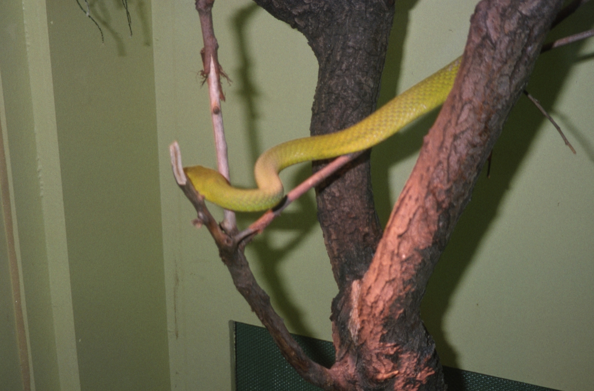'Utställningen ''Dödliga skönheter'', giftormar, på Göteborgs Naturhistoriska museum, Utställningen pågick 8 maj till 5 december 2005. :: Närbild på grön orm i terrarium. :: :: Ingår i serie med fotonr. 6946:1-27.'