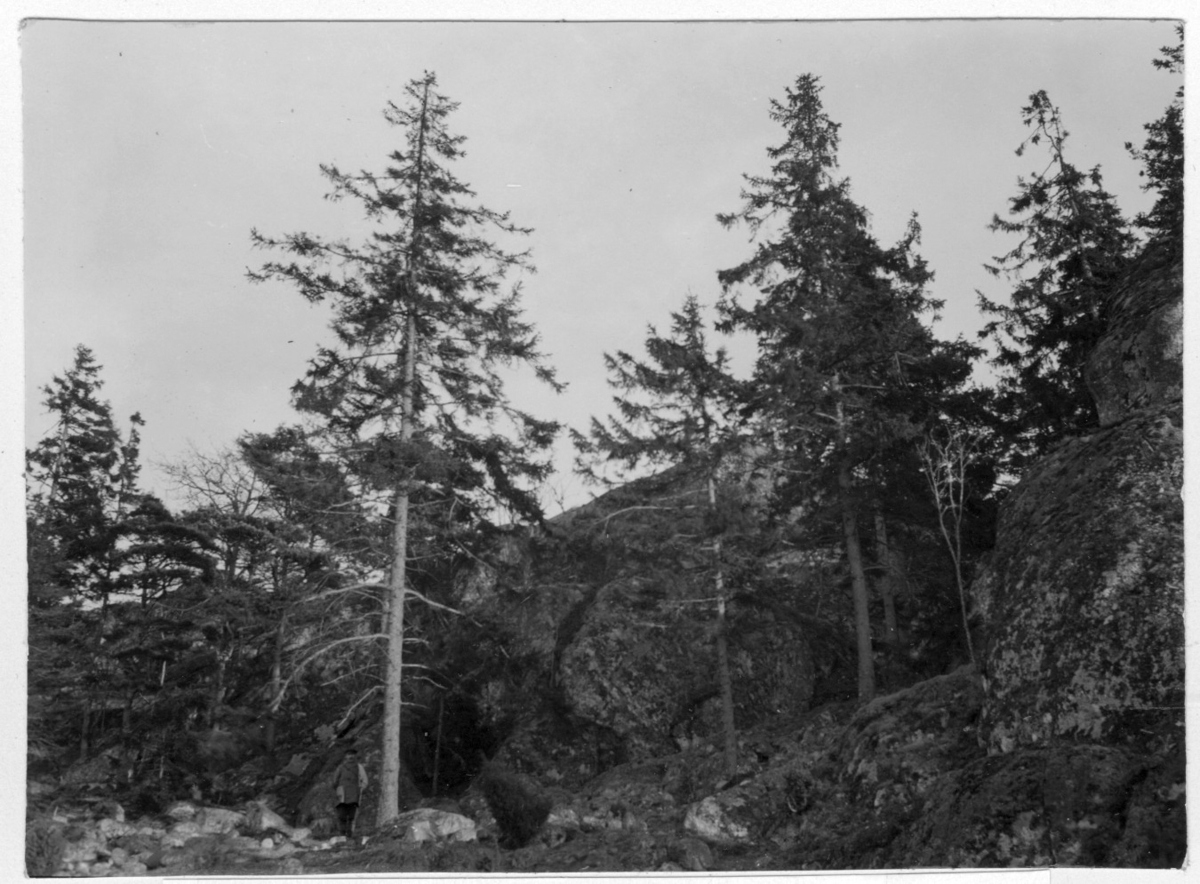 'Bildtext: ''Bild 154. Vid spontana grangränsen. Exponerat läge. Framför (mot väster) förut befintligt granbestånd avverkades för några år sedan.'' Granar växande bland stenblock och berghällar. :: :: Fotonr. 7046:234-275 indelade som ''Naturskogsbestånd i Göteborgs län och Bohus län''. Ingår i serie med fotonr. 7046:1-383, 7047:1-33 och 7048:1-67 med bilder från Länsjägmästare John Lindners bildarkiv.'