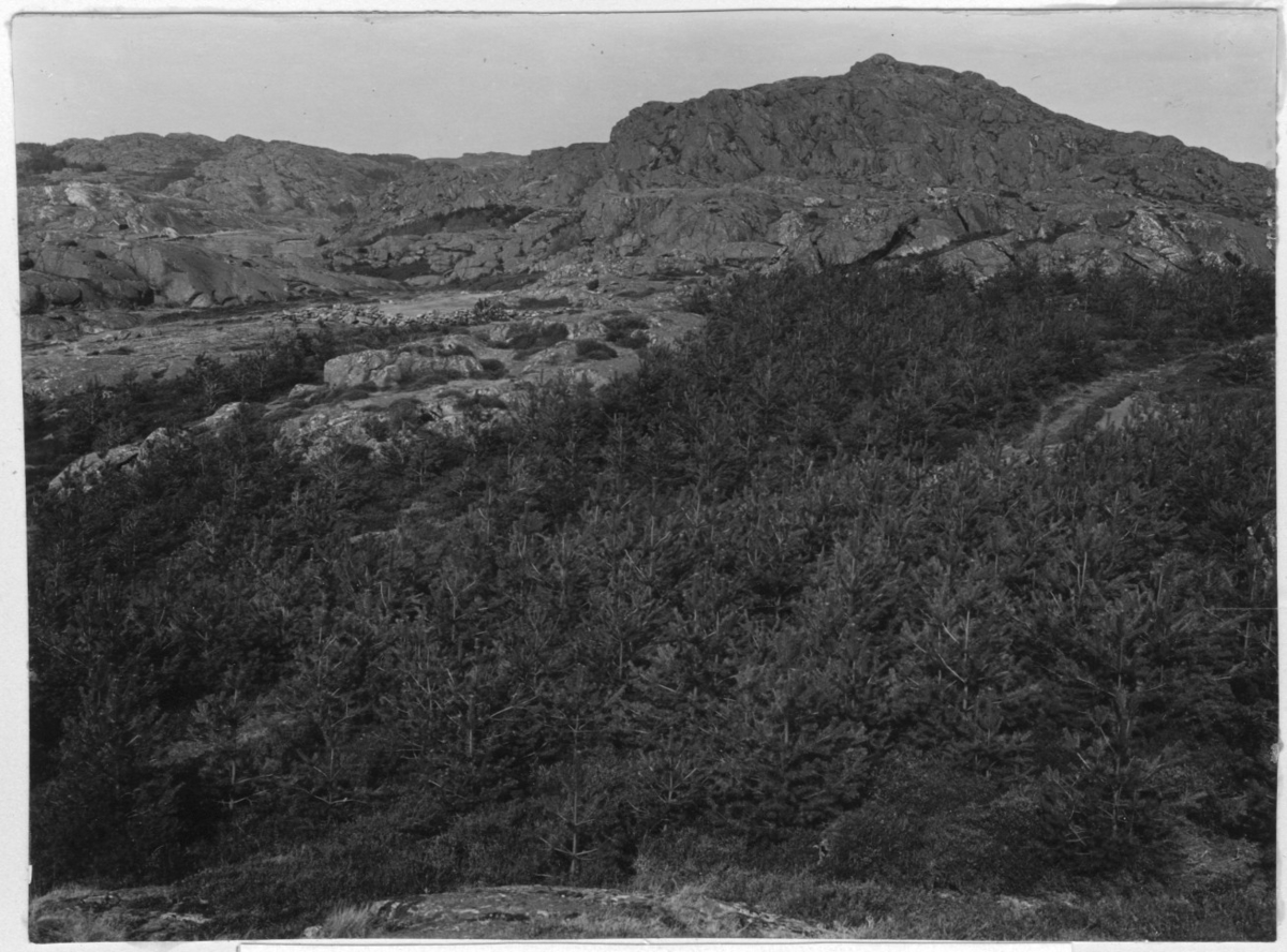 'Bildtext: ''Kulturskog på gammal ljungmark.'' Vy med bestånd av mindre granar i förgrunden, kalt berg bakom. :: :: Fotonr. 7046:275-292 indelade som ''Kulturskogsbestånd i Göteborgs län och Bohus län''. Ingår i serie med fotonr. 7046:1-383, 7047:1-33 och 7048:1-67 med bilder från Länsjägmästare John Lindners bildarkiv.'