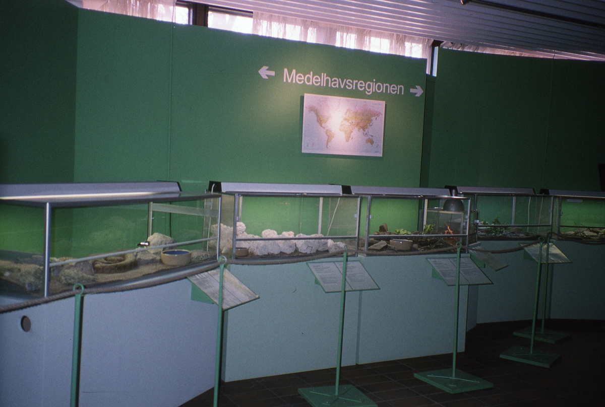 'Utställningen ''Dödliga skönheter'', giftormar, på Göteborgs Naturhistoriska museum, Utställningen pågick 8 maj till 5 december 2005. :: Rad med terrarier med ormar från medelhavsregionen. :: :: Ingår i serie med fotonr. 6946:1-27.'