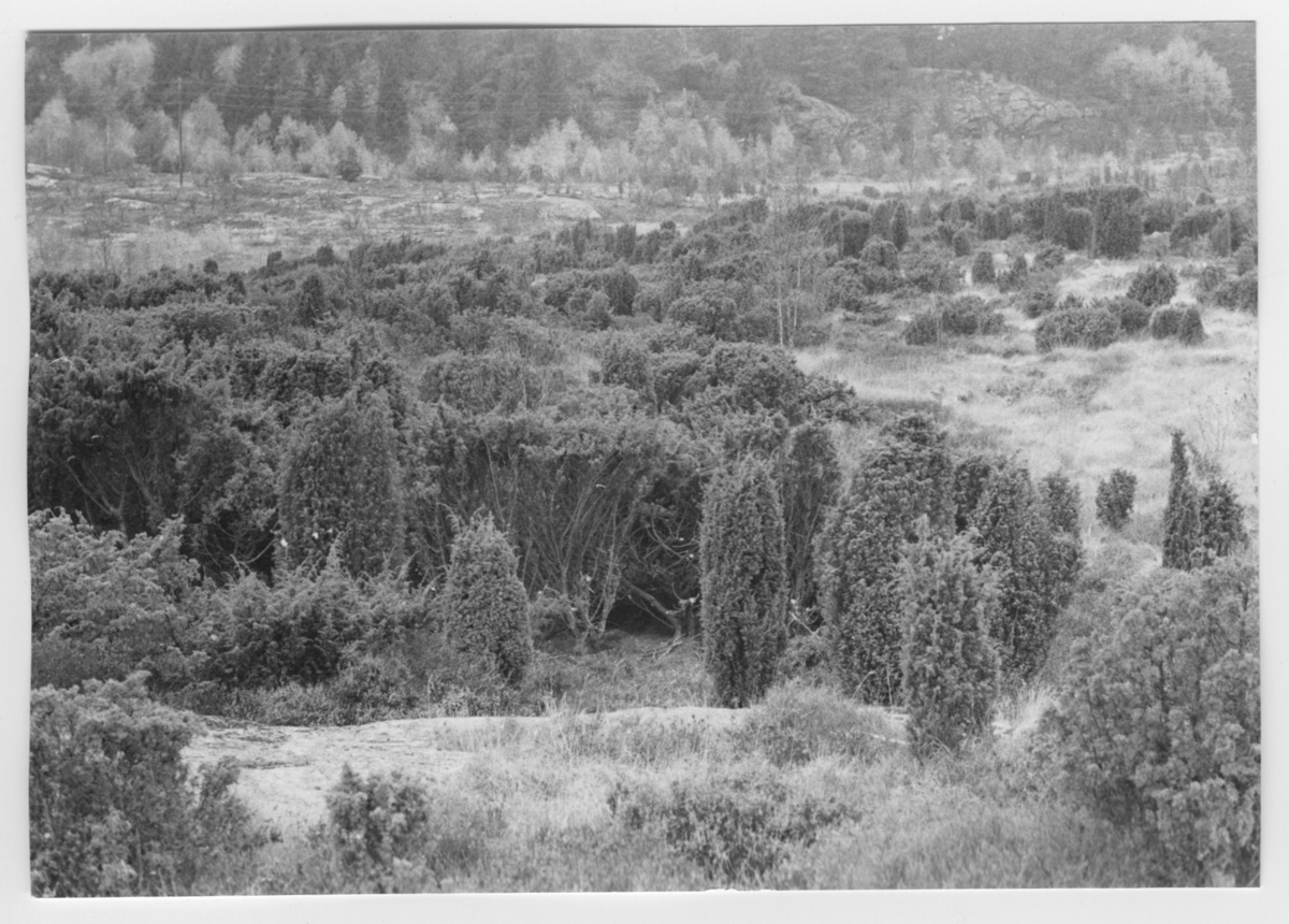 'Bildtext: ''Enbuskar på sumpmark. Riktning 292.'' :: :: Ingår i serie med fotonr. 6970:1-1125, dokumentation av Hisingens naturgeografi, visande landskapsformerna i stora drag och gjord inför exploateringen av området. Platserna för fotograferingen finns utsatta på karta i skala 1:4000 som finns på Göteborgs Naturhistoriska musem. Fotoriktningen mättes med kompass i gammalgrader.'