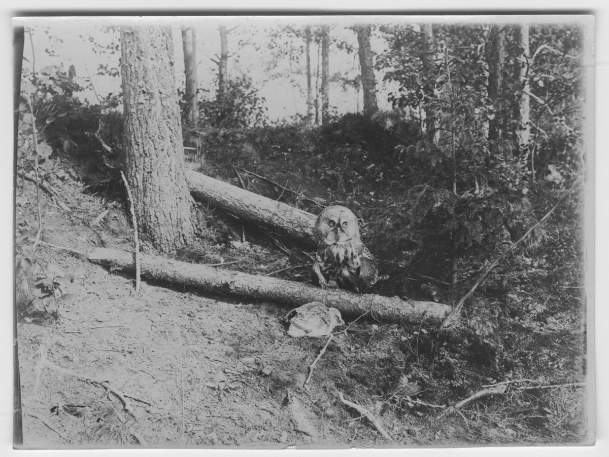 1 st lappuggla med 1 st unge, utanför boet intill trädstam, gran.