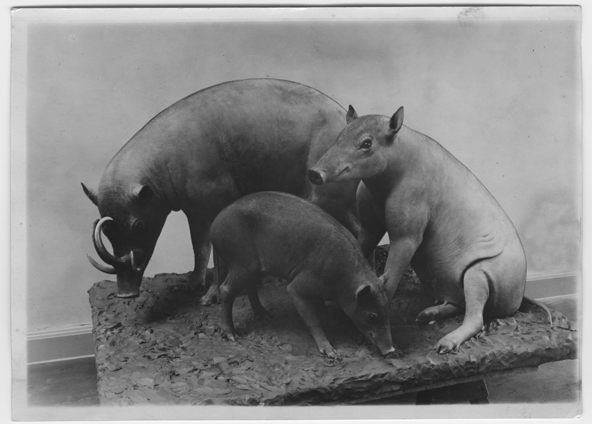 'Monterad grupp hjortsvin 3 djur. Hane och hona ad, och hane juv. :: Specialkatalog, :: Ma.ex.926, :: Ma.ex.927, :: Ma.ex.928. :: Fynddatum: 1917-05-18-1917-05-20. Fyndplats: Indonesien, Nord-Celebes. Monterade av Hilmer Skoog. :: :: Montaget finns utställt i däggdjurssalen i monterskåp nr. 10 på Göteborgs Naturhistoriska Museum (2008-01-18).'