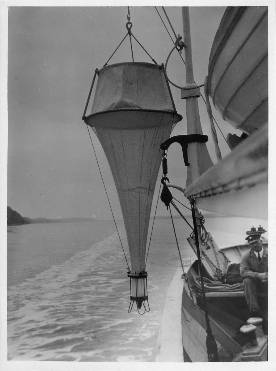 'Hensens ägghåv, hängande på sidan av båten. 1 st man sitter på däck. :: :: Ingår i serie med fotonr. 2782-2792 med bilder av fångstredskap för havsdjur som använts på bevakningsfartyget Skagerak.'