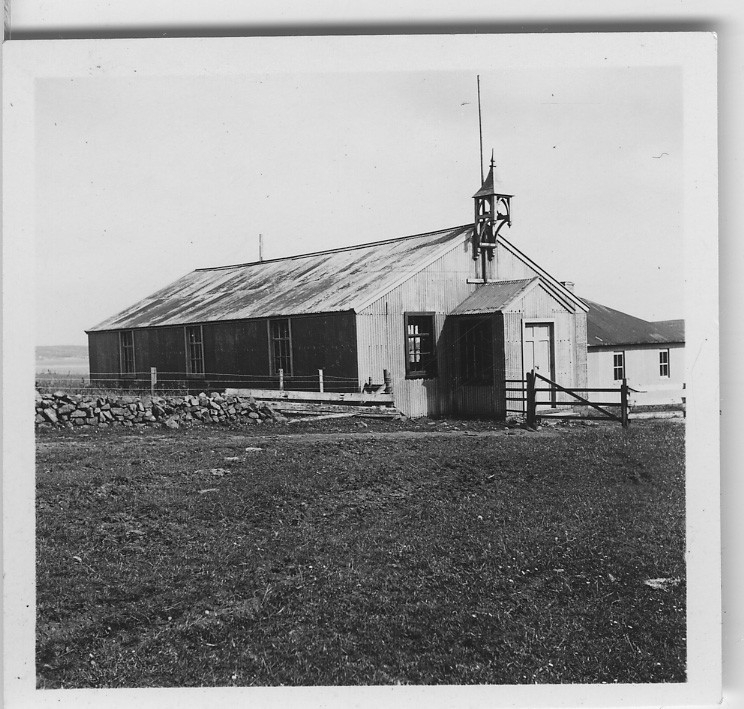 'Från ''Skageraks''-expeditionen till Hebriderna och Shetland: :: :: Enligt anteckning på baksidan av fotografiet: ''Sv.[svenska] sjömanskyrkan i Baltasound''. Vy med byggnad med klocktorn på gaveln. Invid byggnaden stenmur kombinerad med staket. Stengärdesgård. :: :: Ingår i serie med fotonr. 4111:1-43.'