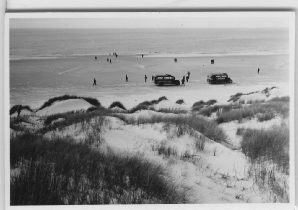 'Biologiska föreningens utfärd till Nordjylland: Blokhus-Lökken: :: :: vy över stranden med bussarna nere på stranden och gruppen gående ute i vattnet. :: :: Ingår i serie med fotonr. 3824-3859, se även fotonr. 3839-3847 från samma utflykt.'