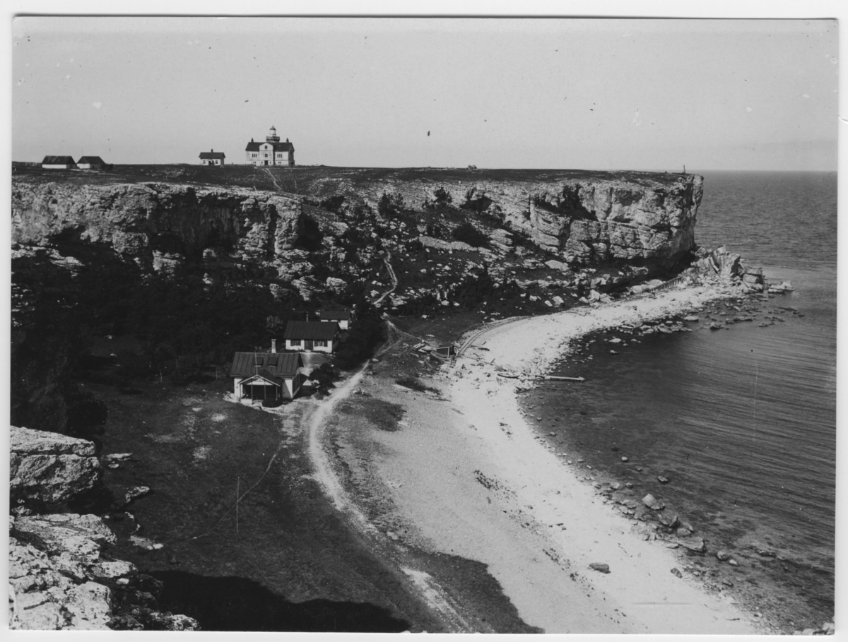 'Vy över vik med hus nere vid stranden och högt uppe på kalkstensplatå. Ser ut att vara 1 fyr på platån. :: :: Ingår i serie med fotonr. 4829-4838.'