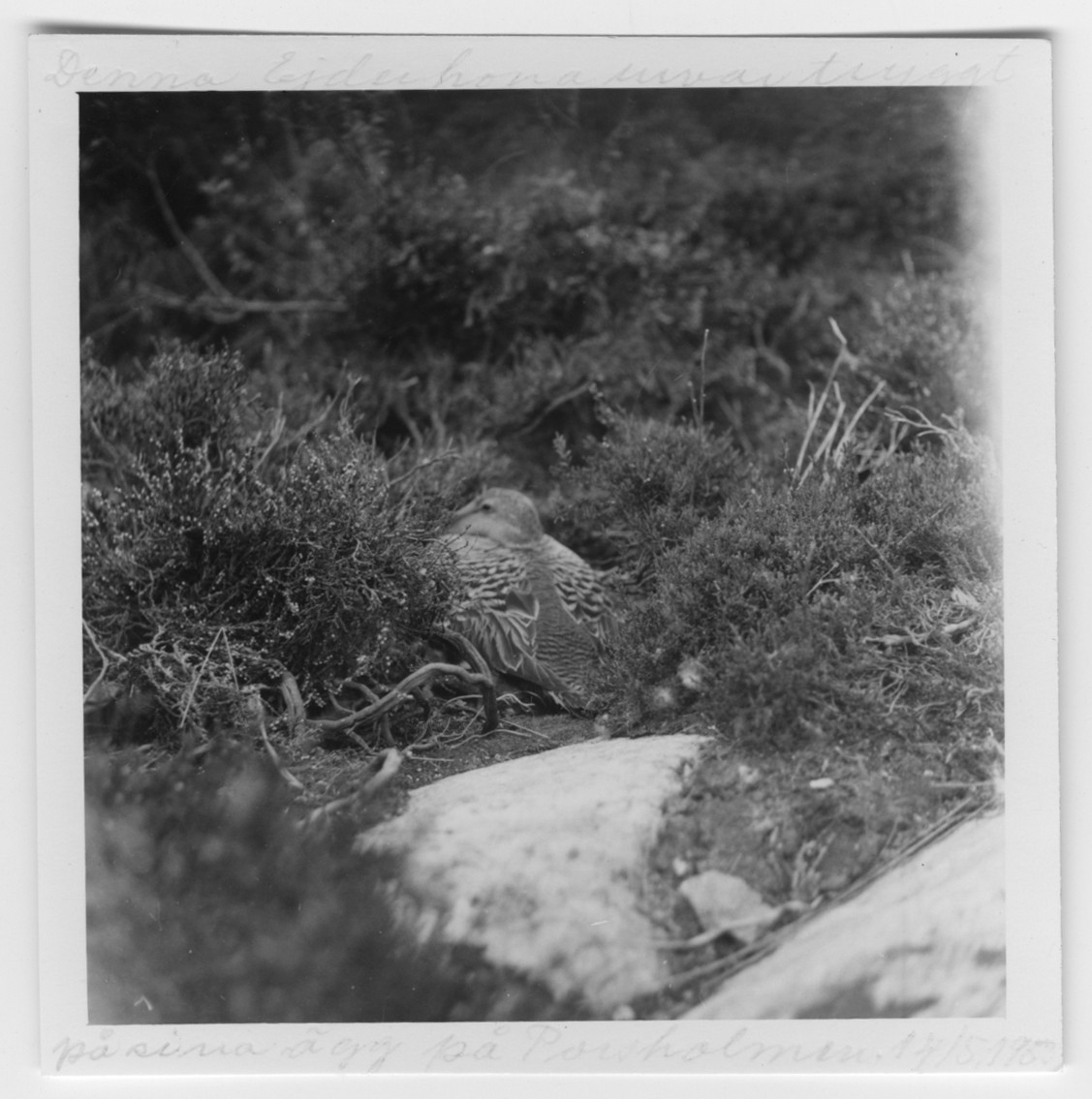 '1 ejderhona på sitt rede i ljungvegetation på berghäll. :: :: Text på fotot: ''Denna ejderhona ruvar tryggt på sina ägg.'' :: :: Ingår i serie med fotonr. 4545:1-34.'