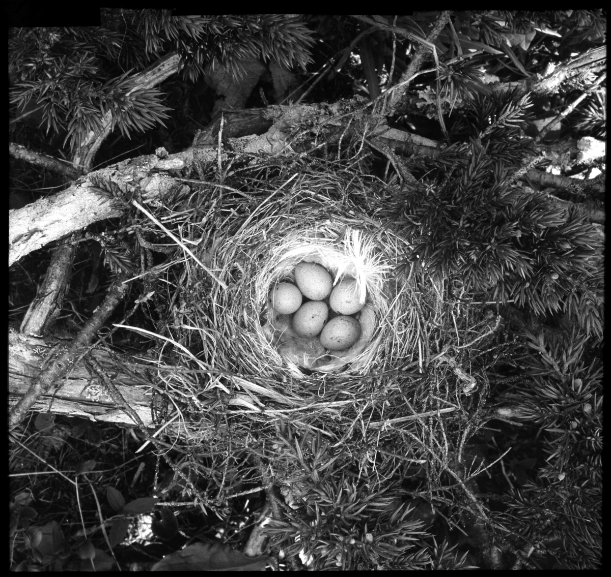 'Bildtext: ''Gråsiska, bo med ägg.'' Boet med 5 ägg sett ovanifrån, boet byggt i en. :: :: Ingår i serie med fotonr. 5157:1-9 numrerade med bildnr 120-128. Se även hela serien med fotonr. 5155-5174.'