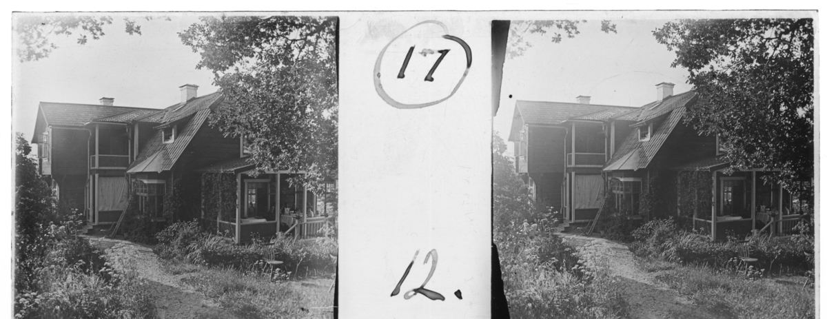 'Bildtext: ''Kalfnäs trip, Kalfnäs, house.'' :: Vy med huset sett mot verandan där 5 vuxna, män och kvinnor, och ett barn sitter vid dukat bord och stolar. Hus med burspråk. Stege lutad mot huset. Pinnstol. Trädgård. Möbler. :: :: Ingår i serie med fotonr. 5248:1-20, se även hela serien med fotonr. 5237-5267.'