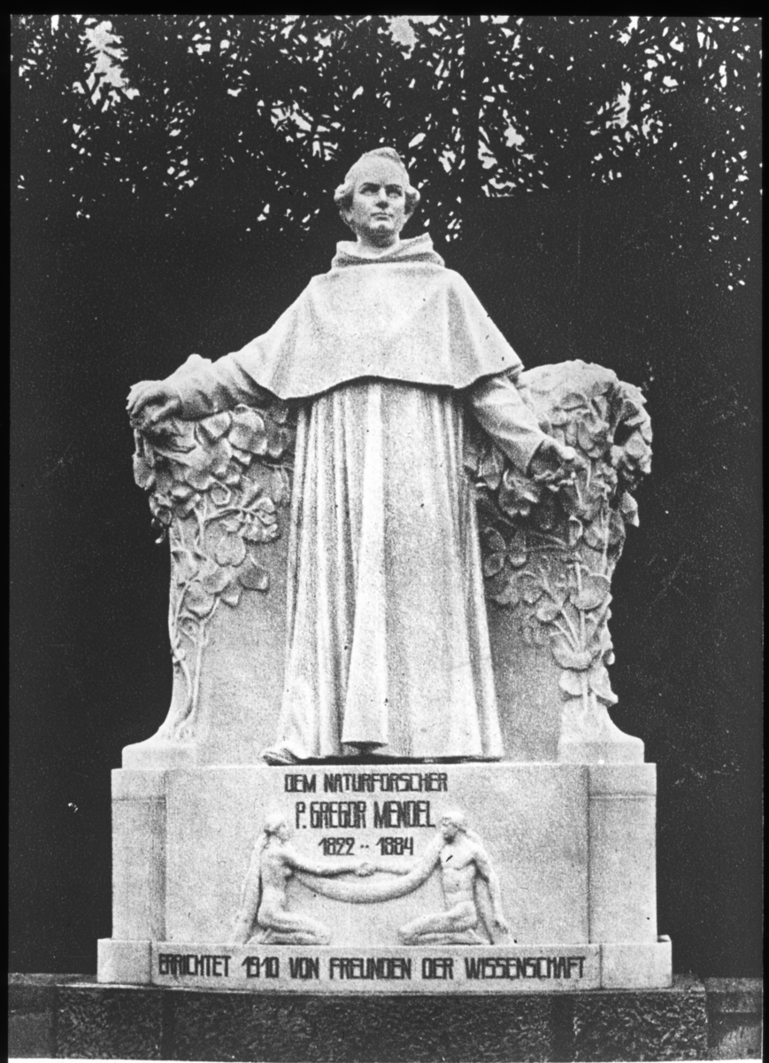 'Bild av staty av Gregor Mendel stående i Brünn. :: :: Ingår i serie med fotonr. 5324:1-45 med repro från böcker eller publikationer. Dessa tillhör bilder som Leonard Axel Jägerskiöld använt i sina föreläsningar.'