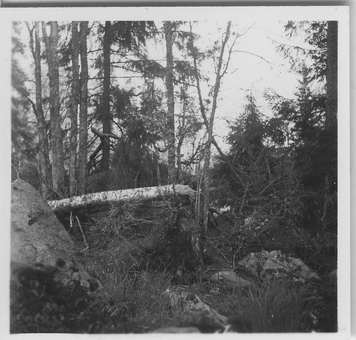 'Biologiska föreningens utfärd till Sveafallen och Villingsbergs kronopark. :: :: Ett bäverfällt träd (björk). Stenblock. Garn. :: :: Se fotonr. 4226:1-34, 4228:1-3 och 4229:1-3 från samma utfärd.'