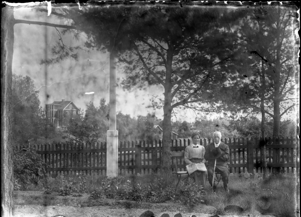 '1 man och 1 kvinna sittande på träbänk invid flaggstång framför trästaket. Furuträd intill. Bakom staketet 1 större trähus, 2 vånings med vindsvåning, på avstånd och 2 mindre träbyggnader. :: :: Ingår i serie med fotonr. 5137 med diverse bilder. Plåtarna ligger i 2 pappaskar. På asken för negativen 9x12 cm och 12x18 cm står texten: ''Fröken Pettersson, Eksjö. Kopieras. Negativ. Alingsås samskola? m.m.'''