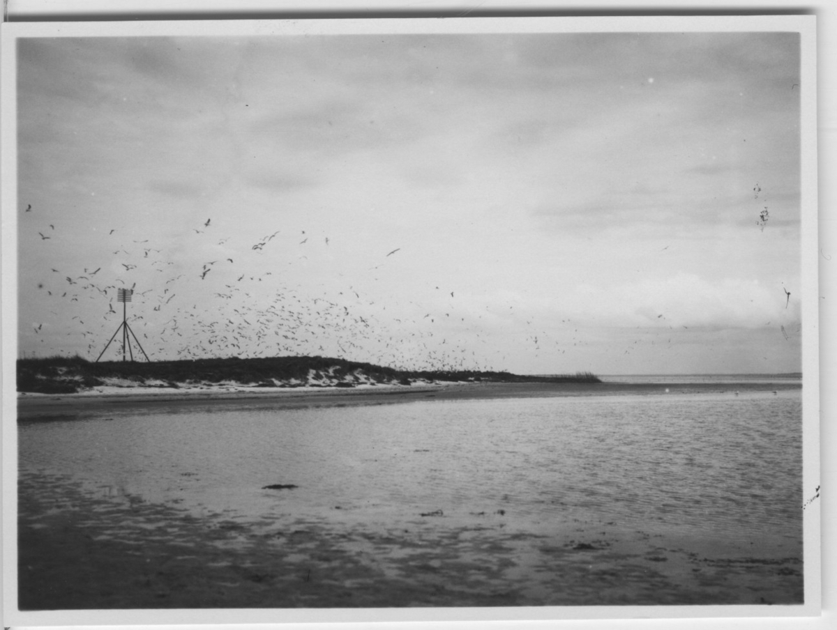 'Göteborgs Biologiska förenings utfärd till Måkläppen och Falsterborev: :: :: ''Fåglar över Måkläppen'', vy in mot Måkläppen. Sanddyner. :: :: Se fotonr. 1384-1395, 1618-1639, 1640-1648 samt 3229 från samma utfärd.'