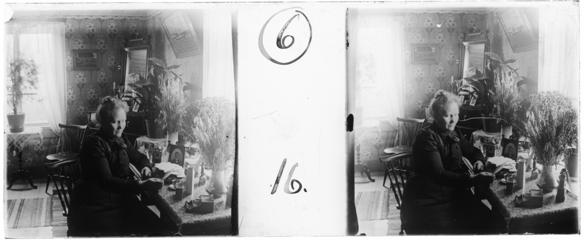 'Bildtext: ''Mor Olga vid skrivbordet.'' :: 1 kvinna, Olga, sittande vid skrivbord. Interiör med blombord, krukväxt, vas med blombukett, fotoramar med foton, byrå med pigtittare med ljushållare, vas, bläckhorn, gardin, duk, tavla, matta. Möbler. Kläder. :: :: Ingår i serie med fotonr. 5252:1-17, se även hela serien med fotonr. 5237-5267.'
