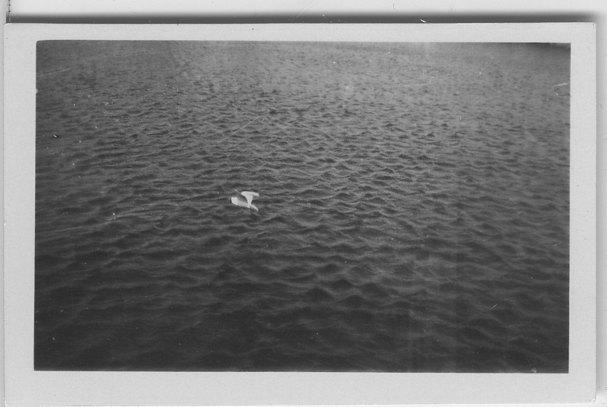 'Akkaexpedition, Bilder från Läsö och från båten (Skandia, FC51, FG51). :: :: Vy över vatten med en fågel vid vattenytan. :: :: Ingår i serie 5089:1-63. Se även fotonr 2401-2453.'