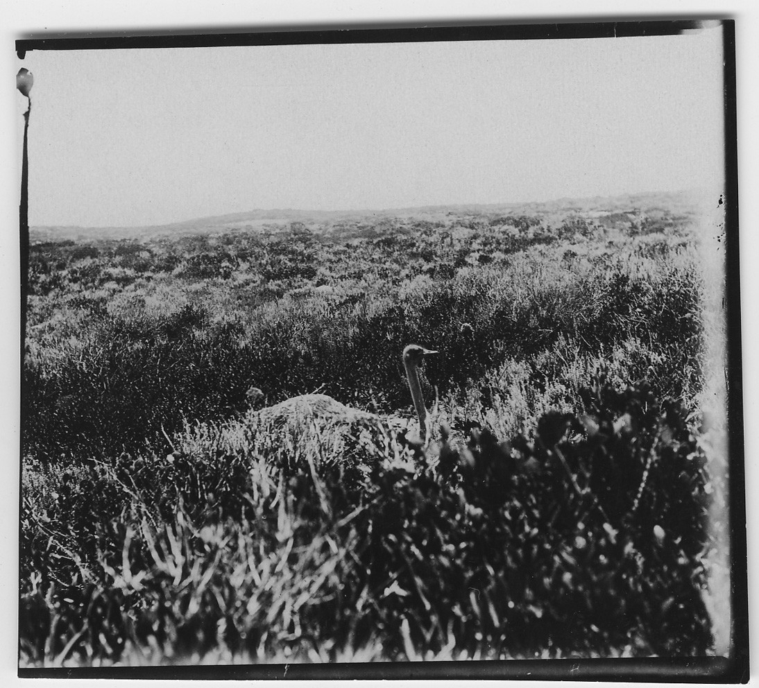 'Strutsfågel på bo. :: :: Ingår i serie med fotonr.167-179, 181-184, 186-191, 193-196, 198-203 samt 205-215 med foton från Hilmer Skoogs expedition till Sydafrika år 1912-1913.'