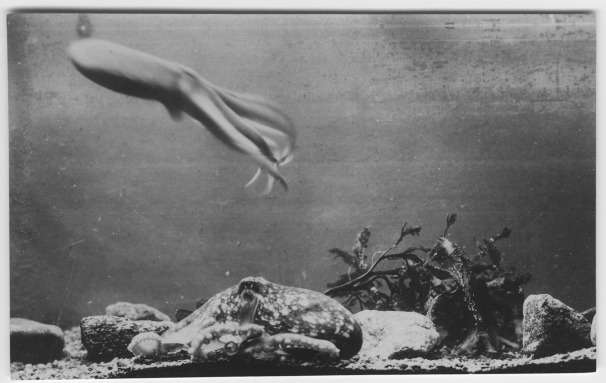 'Bläckfiskar. 1 bläckfisk på botten och 1 simmande. :: :: Ingår i serie med fotonr. 1083-1089.'