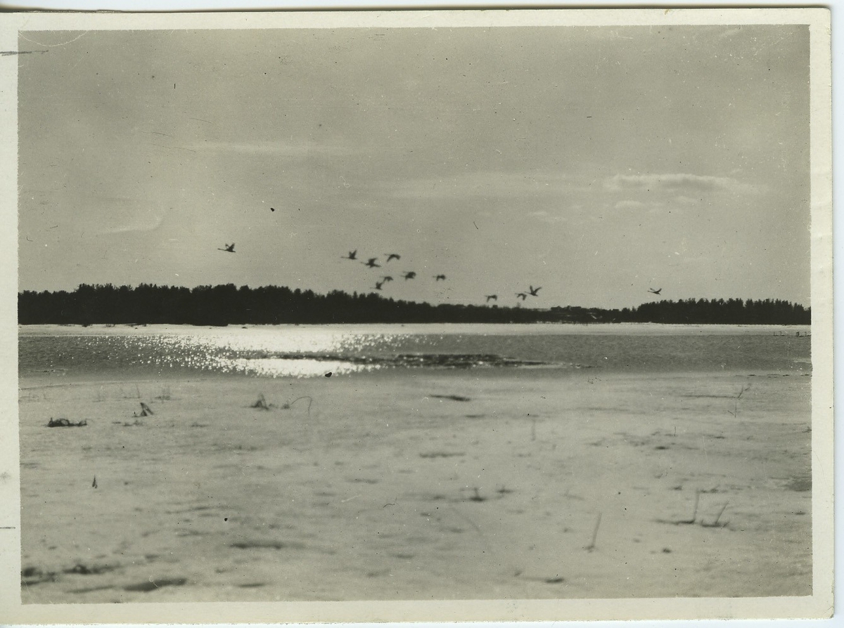 'Lättande sångsvanar i Södra sjön. Vy över sjön med skog i bakgrunden. Fågelmoln. :: :: Serie fotonr 953-971.'