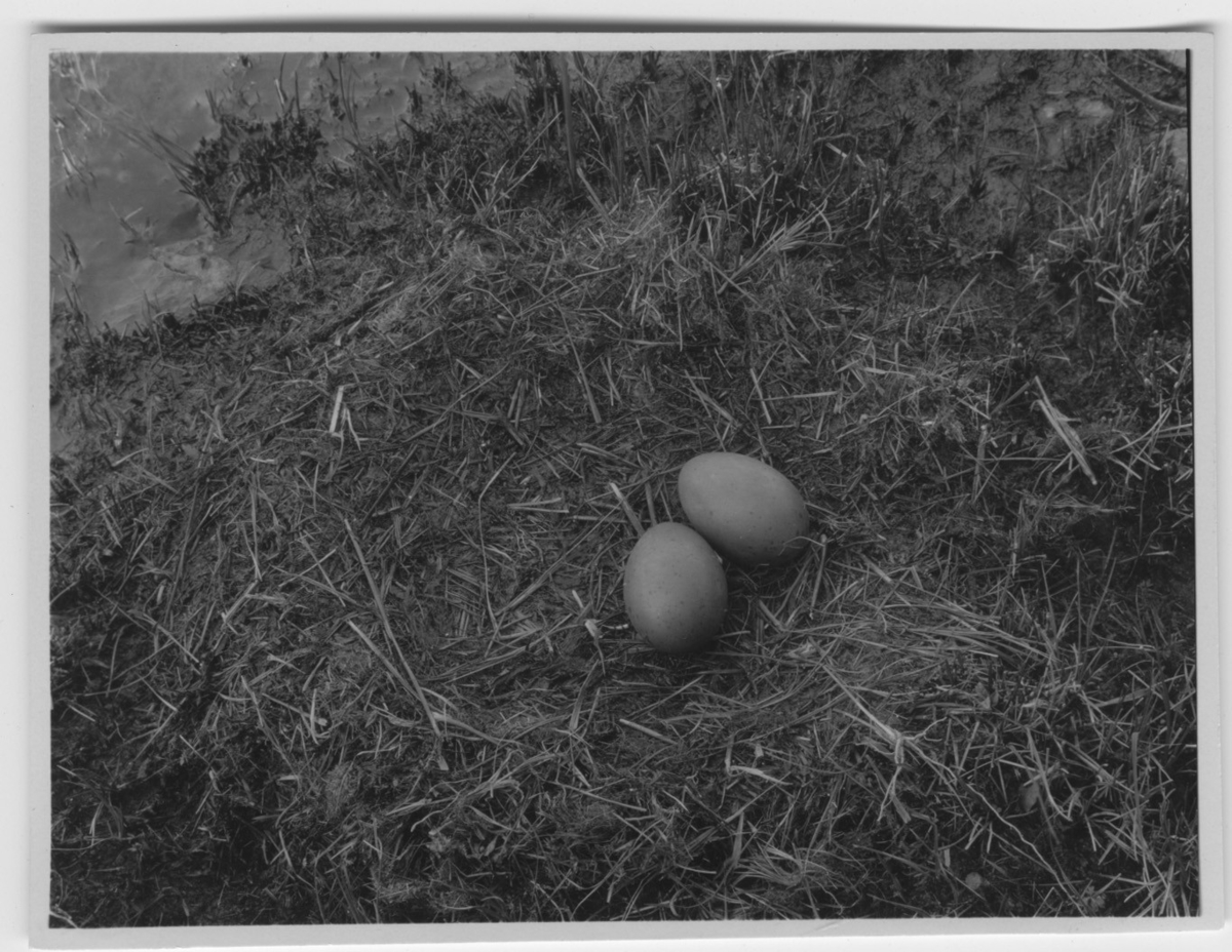 'Storlom, bo med 2 ägg liggande intill vatten. Närbild. :: :: Se serie med fotonr. 1258-1304.'
