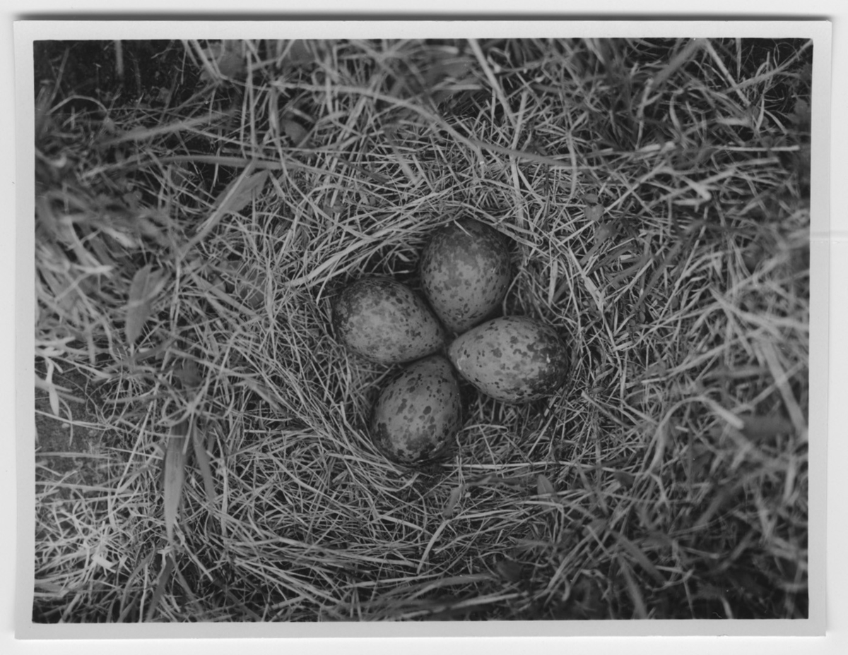 'Bo med 4 st ägg av storspov. Närbild. :: Text på baksidan: ''Bo av storspov. Några par, troligen fyra, häckade på strandängarna i norr och väster.'' :: :: Ingår i serie med fotonr. 2305-2346.'
