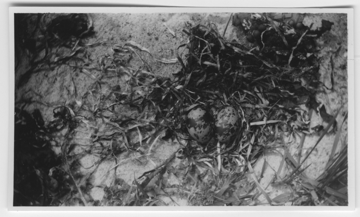 'Bo med 2 ägg på en sandrevel. Fläckiga ägg liggande på bädd av tång på sanden. :: :: Ingår i serie med fotonr. 4401-4440.'