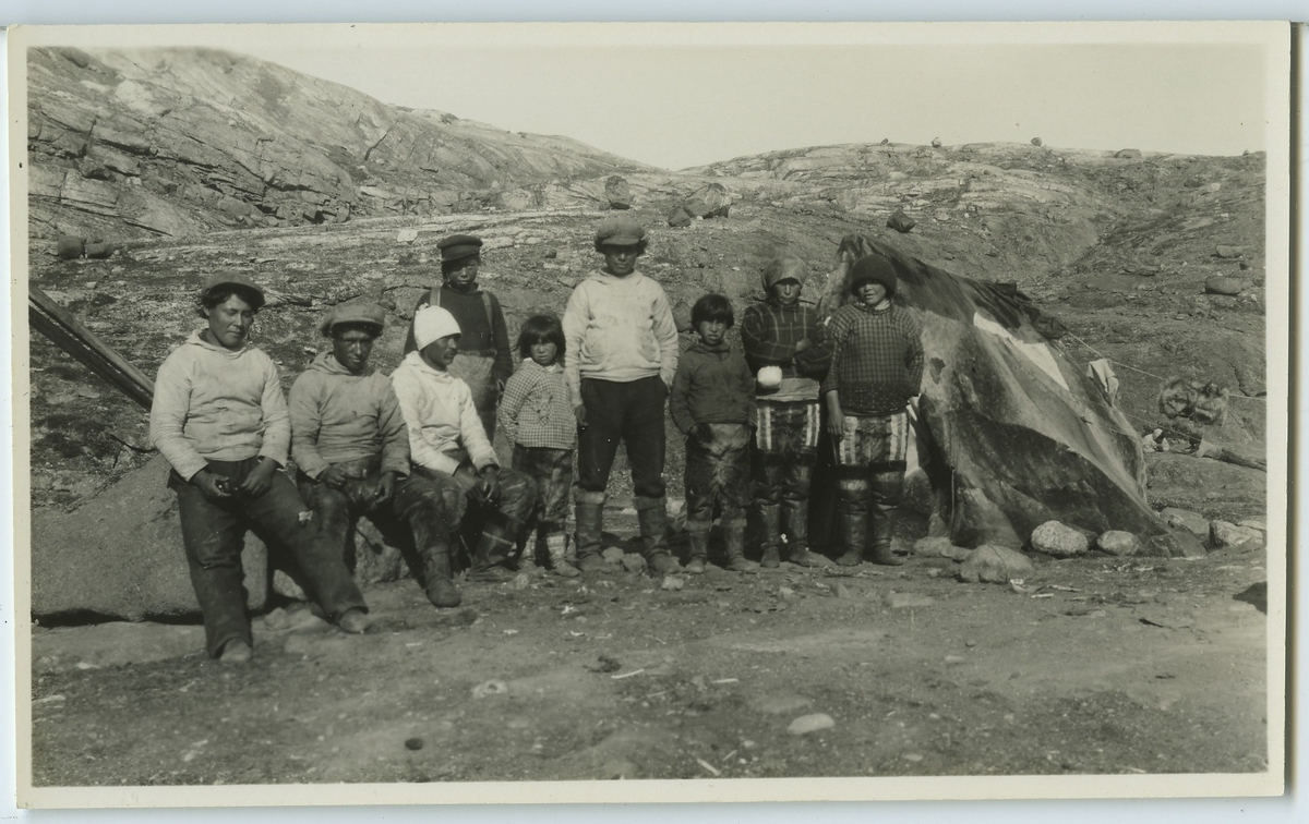 'Foto av 9 inuiter (eskimåer), inuiter, utanför ett skinntält på ''Kingigtokön'', enligt Frits Johansens dagbok. Enligt dageboken: Eskimåerna består av 1 tältande familj på 6 vuxna personer och 2 små pojkar. Med på bilden är också 3 inuiter (eskimåer) som arbetade åt Frits Johansen. I bakgrunden berg. Män, kvonnor, barn, ungdomar. Kläder. Klädsel. :: :: Ingår i serie Fotonr. 5217:1-103. Se även hela fotonr. 5202-5218 med bilder från Frits Johansen.'