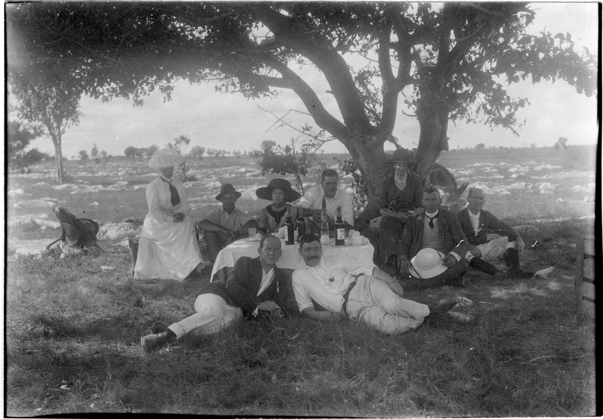 'Diverse fotografier från bl.a. dåvarande Nordrhodesia, nu Zambia, tagna av Konsul Magnus Leijer. :: :: En grupp m sex män och tre kvinnor sittandes i gräs intill ett picnic-bord med vinflaskor. I bakgrunden öppet landskap m fåtal träd.'