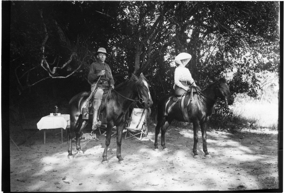 'Diverse fotografier från bl.a. dåvarande Nordrhodesia, nu Zambia, tagna av Konsul Magnus Leijer. :: :: En man och en kvinna på en varsin häst, ståendes invid träd, framför stolar och dukat bord.'