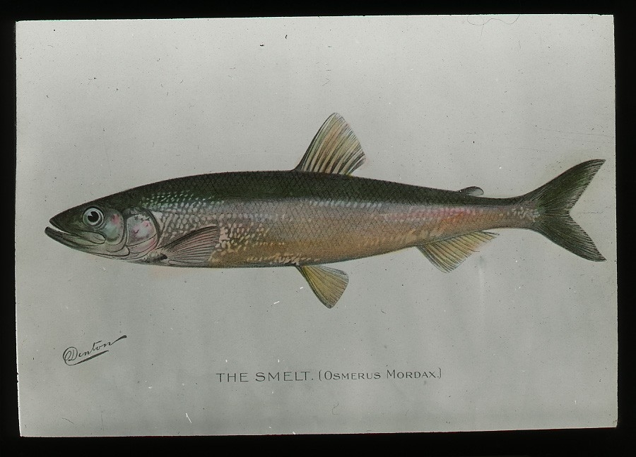 '1 st illustration av norsfisk. Text under bilden: ''The smelt. Osmerus mordax.'' Text på glaset: ''Department of the interior.'' Text under bilden: ''The Smelt (Osmerus mordax) :: :: Ingår i serie med fotonr. 5205:1-20. Se även hela fotonr. 5202-5218 med bilder från Frits Johansen.'