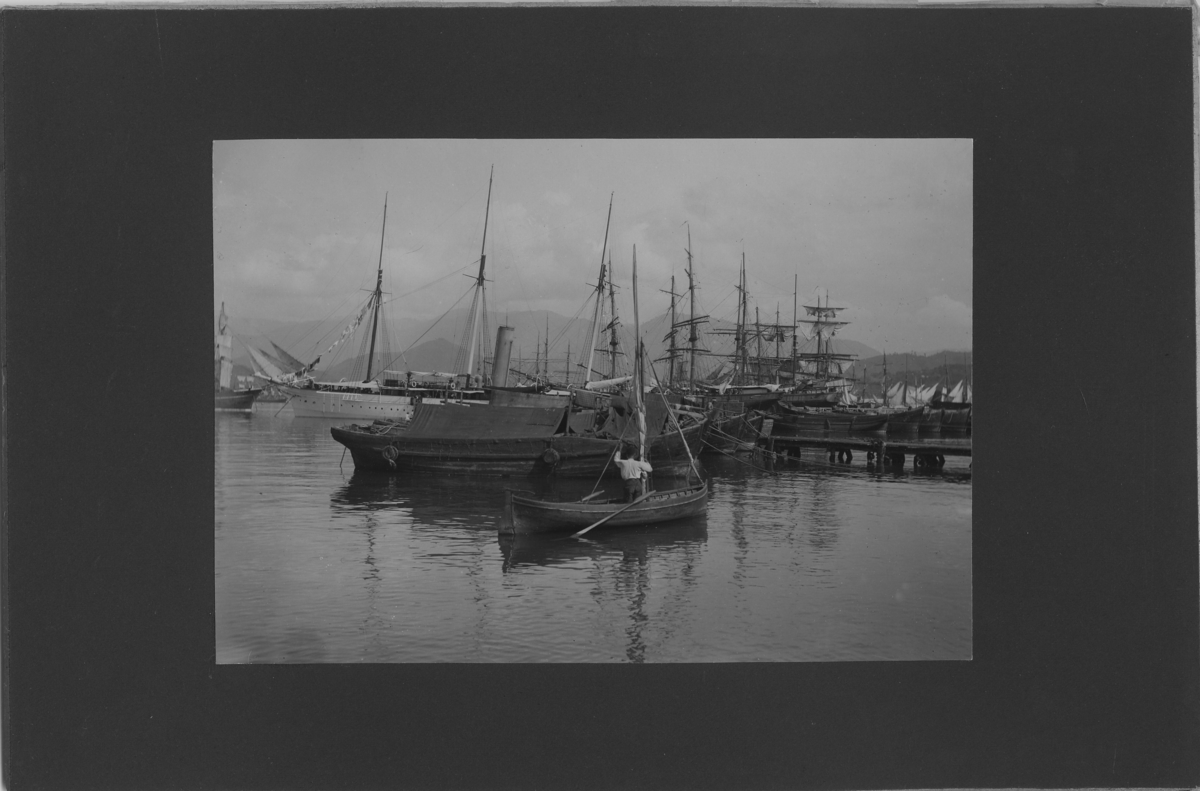 'Hamnbild, många båtmaster och i förgrunden en liten segelbåt/eka med en man som håller på med seglet. :: :: Ingår i serie med fotonr. 5288:1-30. Se även fotonr. 5269-5292 med bilder från Stuxbergs resa till Kaukasien.'