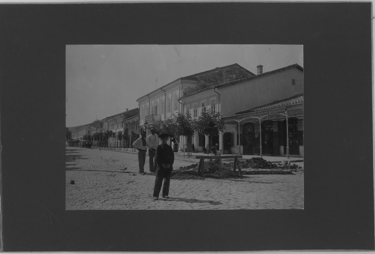'Gatuvy med kullerstensgata där en grupp människor, män är samlade vid en grop, vägarbete. Längs gatan hus och det kör en häst och vagn på gatan. :: :: Se serie med fotonr. 5273:1-17. Serie fotonr 5269-5292, Stuxbergs resa till Kaukasien, 1897.'