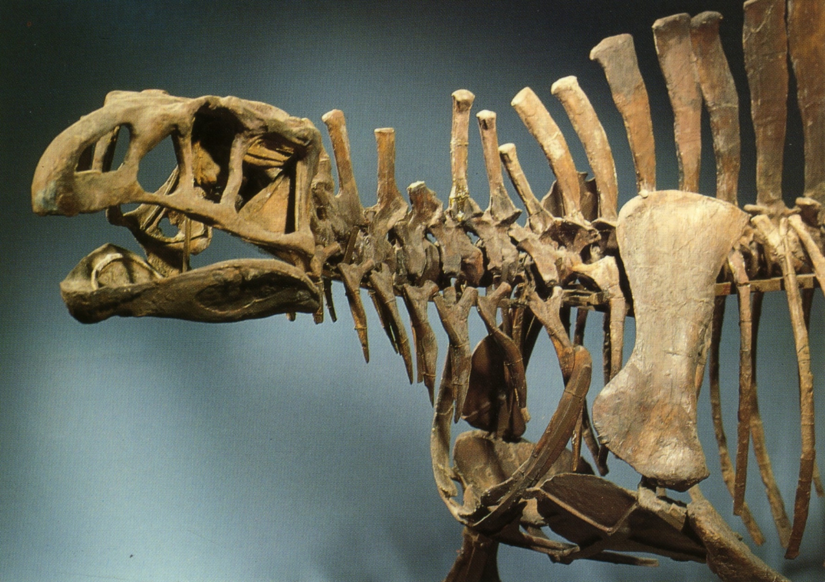 'Ingår i en serie med Fotonr. 5419 med Göteborgs Naturhistoriska museums olika vykort genom åren. :: :: Del av skelett från Thecoddont (dinosaurie)'