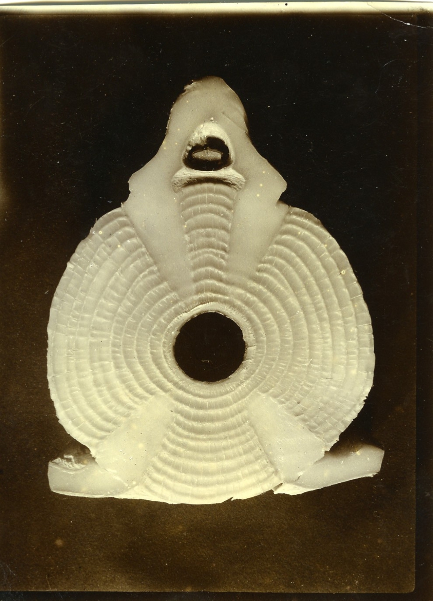 'Brugd, tvärsnitt av ryggrad, hane juv. strandad vid Knösund, Kyrkosund. Coll.an. 3396-3400. Fynddatum: 1914-02-06. :: :: Ingår i serie med fotonr. 545-557:7. :: :: Preparatet finns utställt i monterskåp nr. 322 i fiskgången på Göteborgs Naturhistoriska Museum (2008-02-15).'